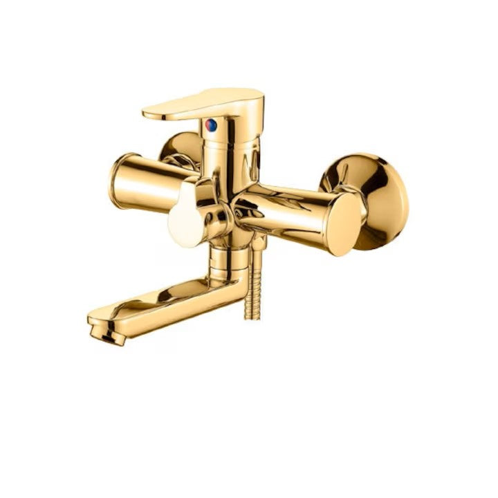 Baterie pentru cadă cu montaj pe perete, fabricată din alamă sanitară tratată împotriva coroziunii, cu finisaj auriu lucios rezistent. Este echipată cu pipă rotativă (versiune lungă sau scurtă) și cartuș ceramic de 35 mm pentru control eficient al debitului și temperaturii. Dispune de mecanism de deviere integrat pentru comutare rapidă între cada și dușul de mână (accesoriile de duș nu sunt incluse).