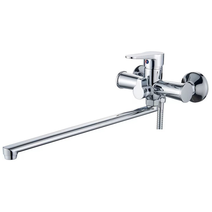 Baterie pentru cadă cu montaj pe perete, realizată din alamă sanitară tratată anti-coroziv, cu finisaj rezistent la uzură. Prevăzută cu pipă lungă rotativă și cartuș ceramic de 35 mm, asigură control precis asupra temperaturii și debitului de apă. Mecanismul de deviere integrat permite comutarea rapidă între funcția de umplere a căzii și cea de duș (accesoriile de duș nu sunt incluse).