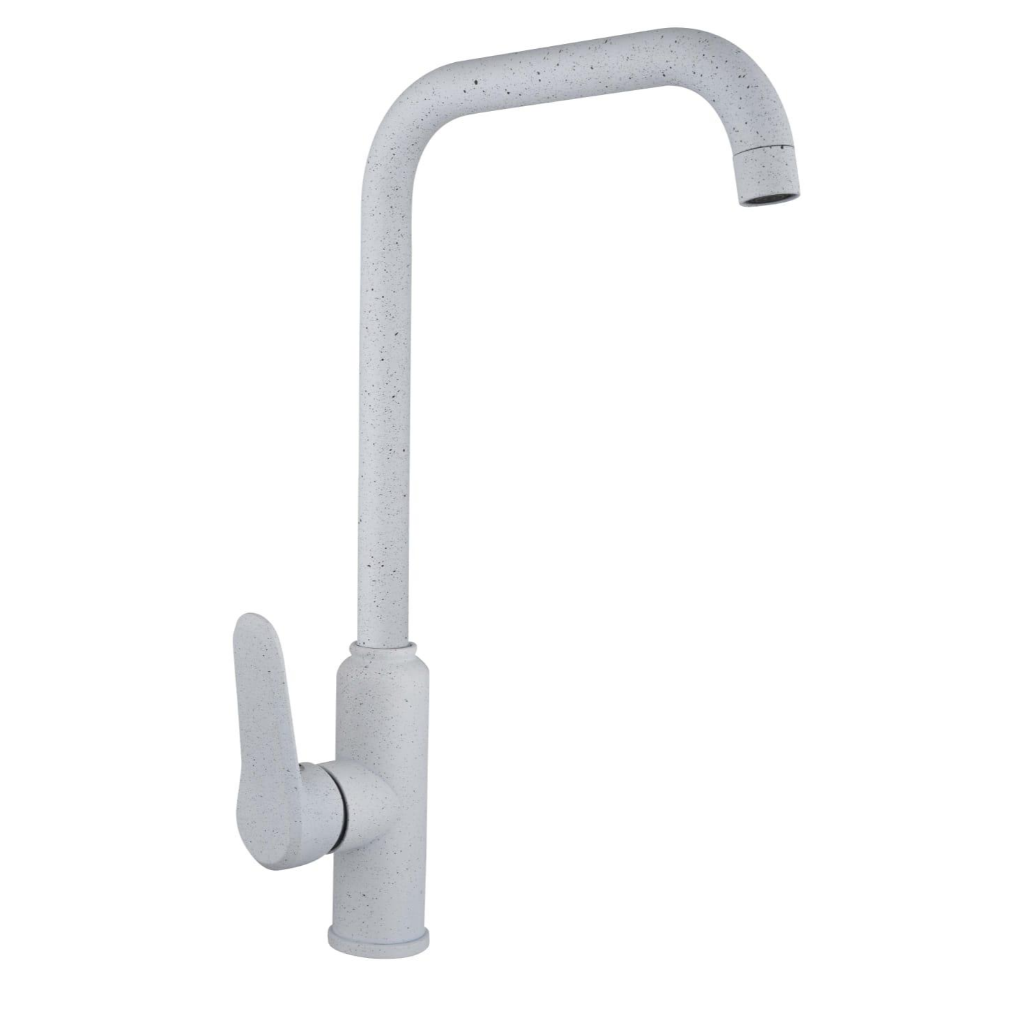 Baterie de bucătărie cu pipă pătrată, realizată din alamă sanitară cu finisaj alb. Materialul este rezistent la coroziune, pete și zgârieturi.