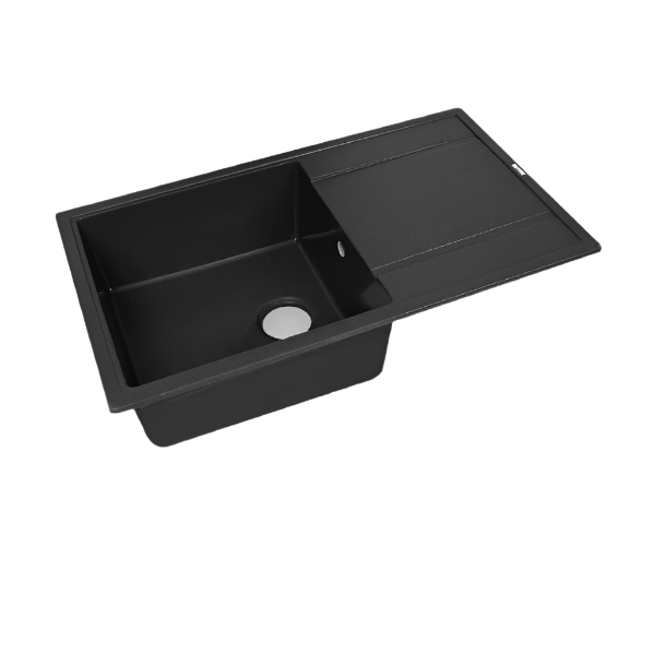 Chiuvetă de bucătărie din compozit, cu o cuvă adâncă și picurător lateral integrat. Modelul Aura 75 oferă funcționalitate practică și o suprafață rezistentă la uzură, temperaturi ridicate și pete. Este potrivită pentru instalare pe blat și se livrează cu sifon inclus pentru montaj facil.