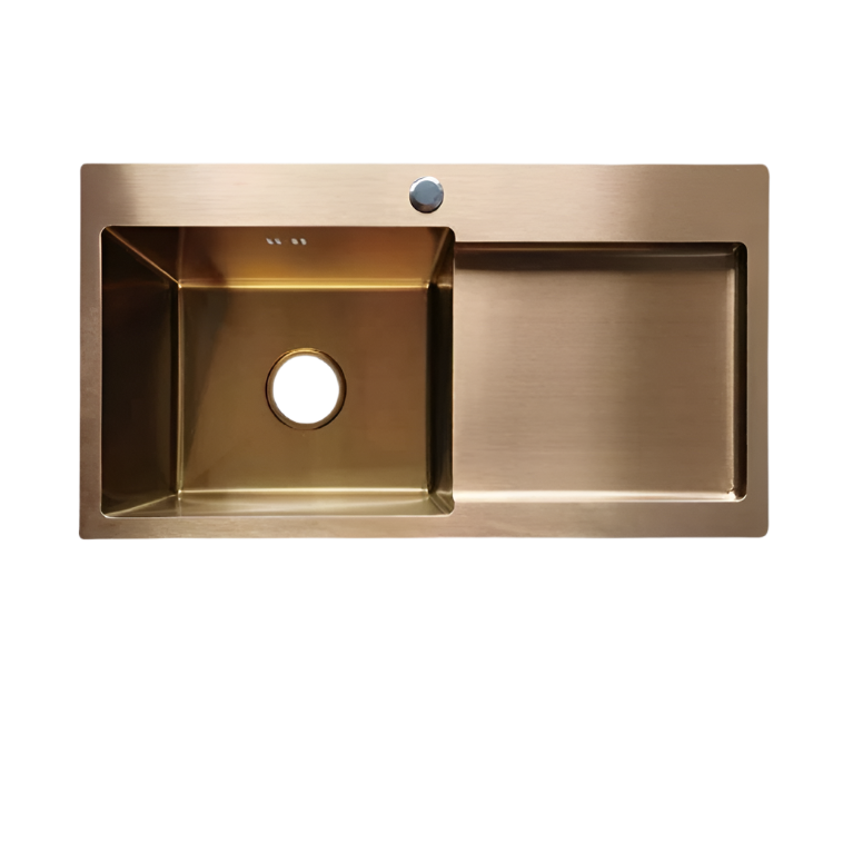 Chiuvetă de bucătărie realizată manual din inox SUS304, cu dimensiuni de 80 x 50 cm și finisaj auriu mat satinat. Modelul dispune de cuvă spațioasă și zonă laterală utilitară, fiind potrivit pentru montaj pe blat sau sub blat. Construcția robustă din inox de 1.2 mm grosime oferă durabilitate și funcționalitate optimă.