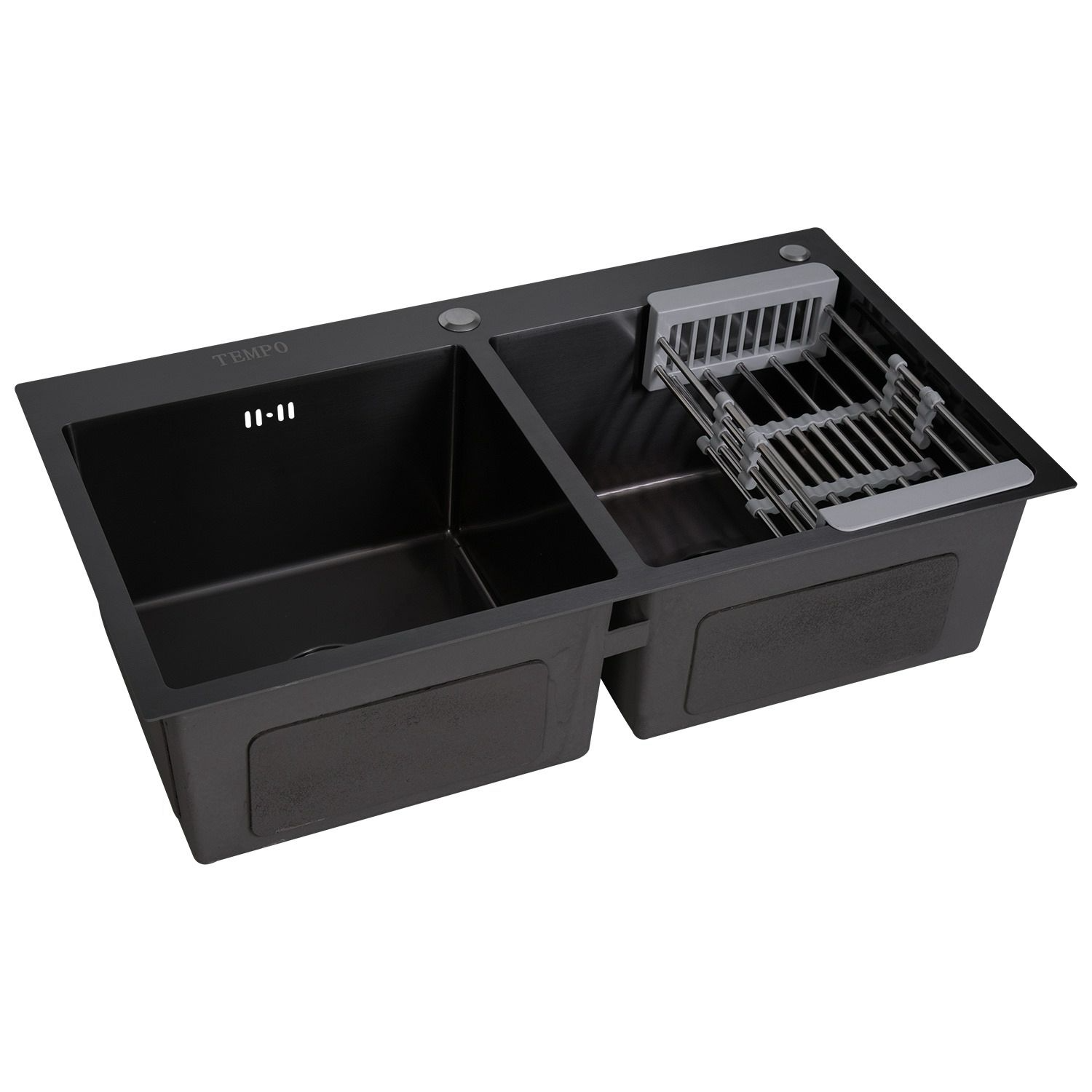 Chiuvetă bucătărie inox negru mat handmade, 80x45 cm, 2 cuve, montaj pe blat sau sub blat, cu accesorii incluse