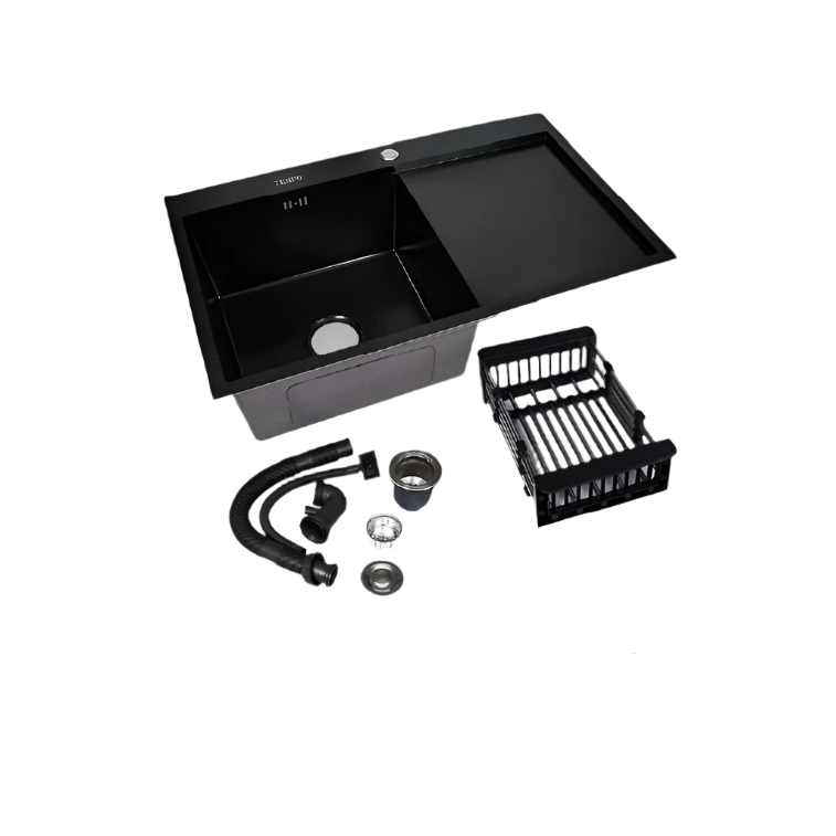Chiuvetă de bucătărie cu o cuvă, realizată manual din inox SUS304 cu grosime de 1.2 mm. Modelul are dimensiuni de 80 x 50 cm și finisaj negru mat, tratat anti-amprentă. Este potrivită pentru montaj pe blat sau sub blat și este livrată împreună cu accesorii utile pentru utilizare eficientă.