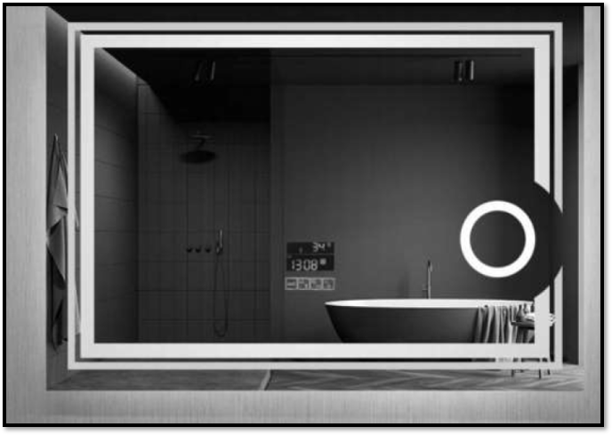 Oglinda LED din seria 694, cu dimensiuni de 75x100 cm, integrează funcționalități avansate precum iluminare LED, sistem de redare audio și afișaje digitale, într-un format rectangular eficient și precis.