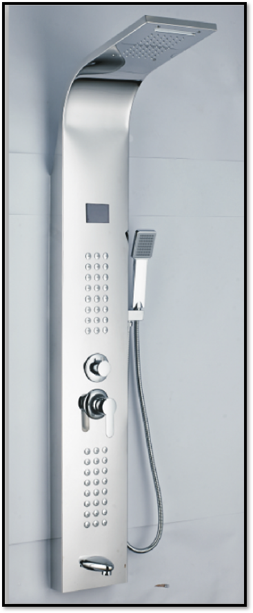 Panelul de duș este un sistem complet cu funcții multiple, conceput pentru montaj vertical și utilizare în băi dotate cu alimentare standard la apă. Disponibil în trei finisaje – crom lucios, negru mat și auriu metalic – include cap de duș fix, duș de mână și duze de hidromasaj, cu sistem de comutare integrat.