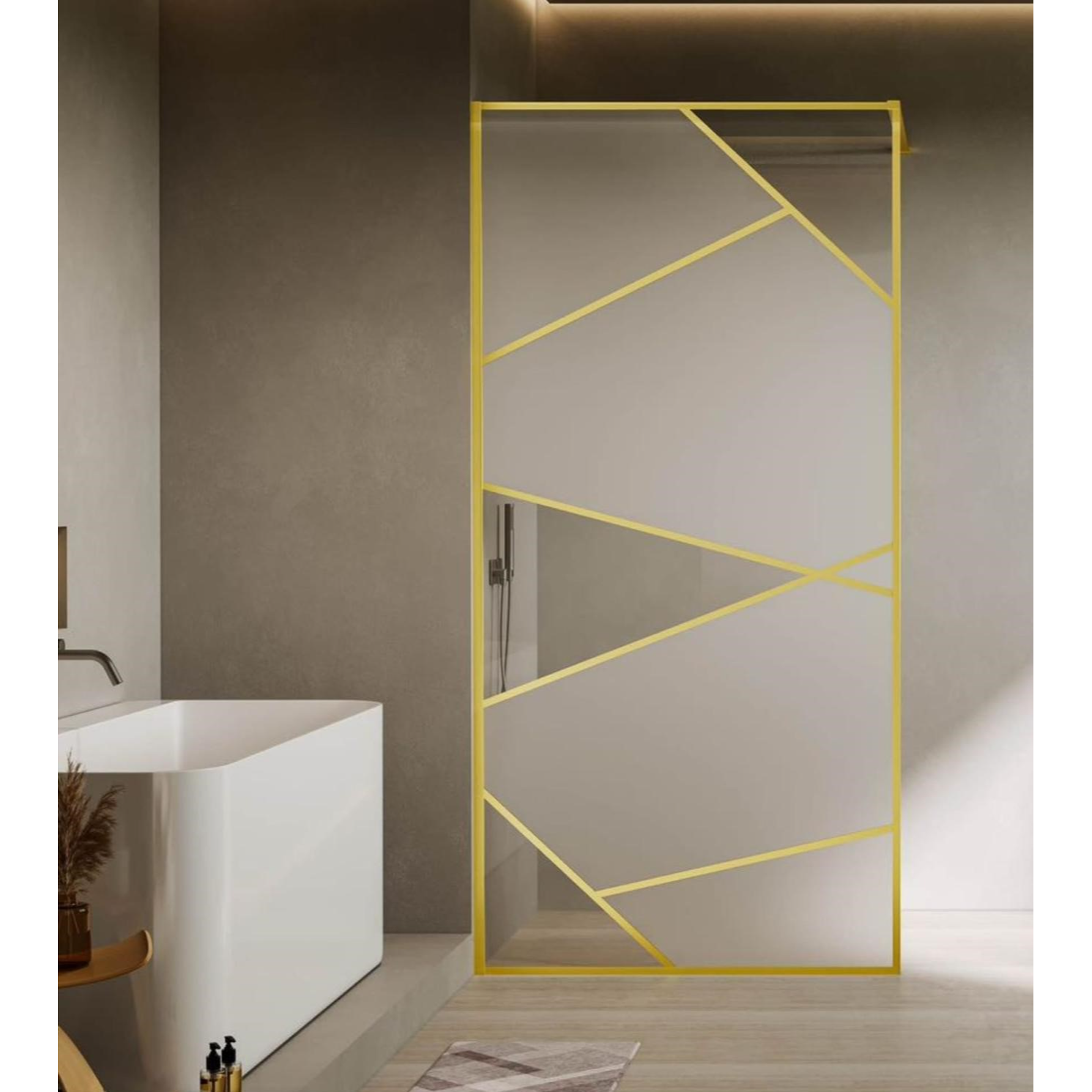 Paravanul de duș Walk-In 90x190 cm este realizat din sticlă securizată cu grosimea de 8 mm și prezintă un model decorativ Laser Gold, format din linii verticale aurii. Structura fixă, fără ușă, permite montajul pe cădiță sau direct pe pardoseală, delimitând eficient zona de duș.