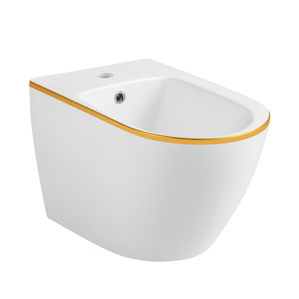 Vas Bideu Suspendat Alb Lucios cu Detaliu Auriu B206WG, Ceramica Sanitara, Montaj pe Perete